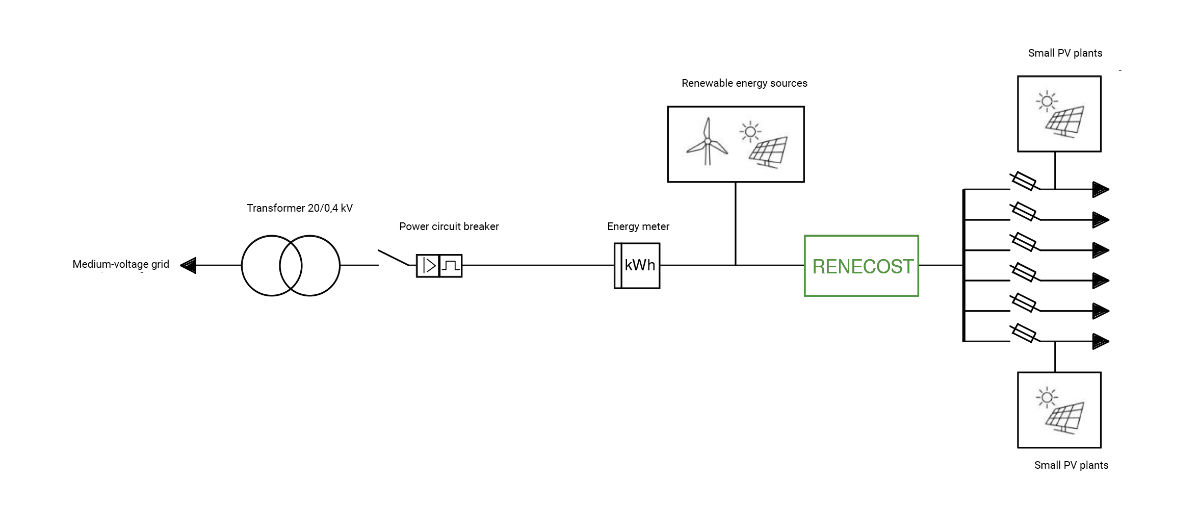 The system can also be installed on an outgoing feeder of a low-voltage main distribution board (NSHV). In this case, only part of all consumers is supplied with regulated, reduced and stabilised voltage. The system must be protected by an upstream protective device (fuse or circuit breaker) whose rated current corresponds to the rated current of the system.