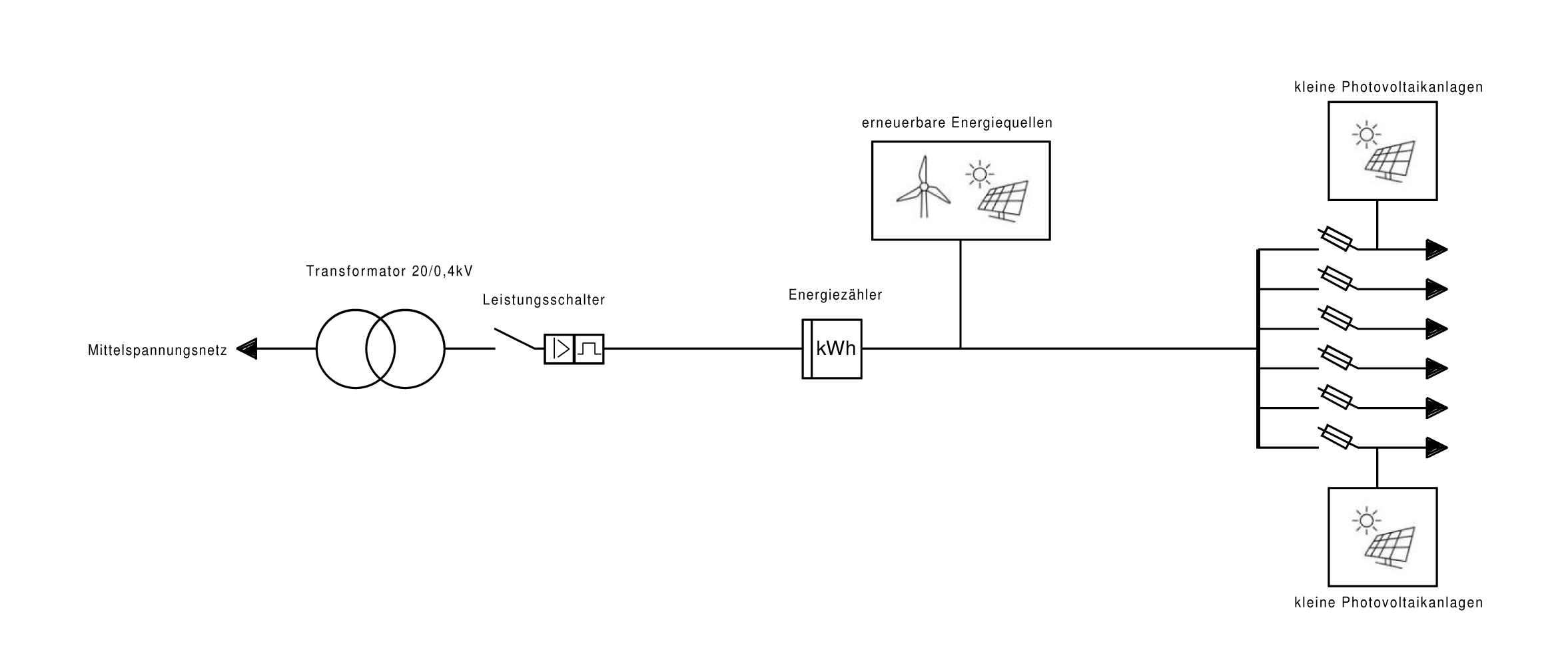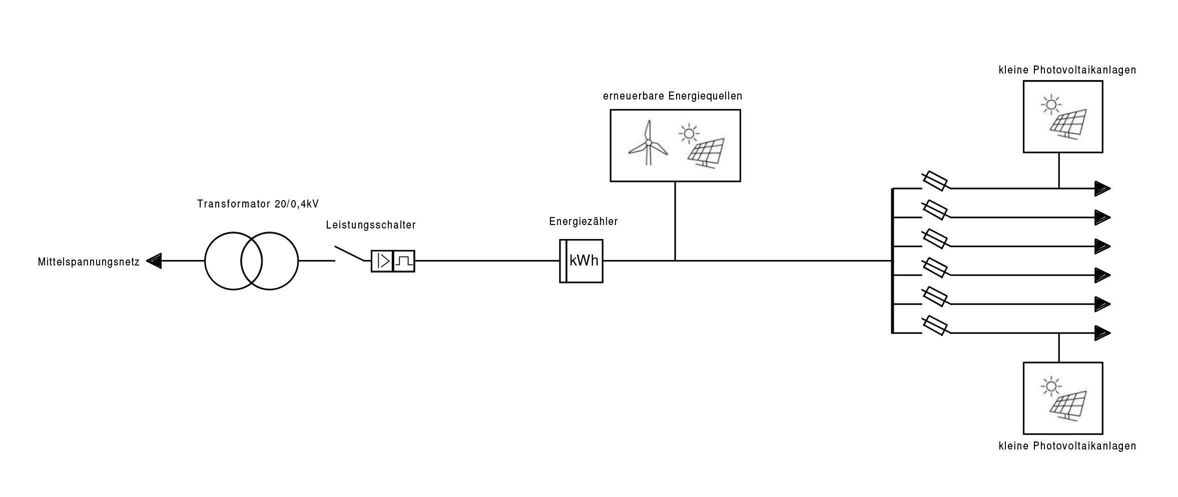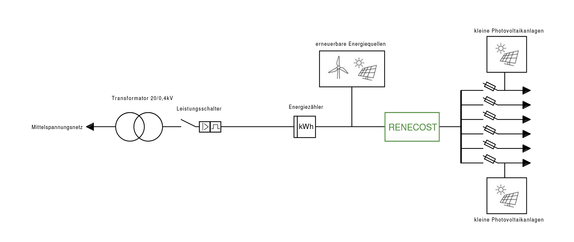 Direkt nach der Trafostation auf der Niederspannungsseite hinter dem Energiezähler und vor der NSHV-Verteilung montiert wird. Dabei ist zu achten, dass die Renecost-Anlage hinter der Hauptabsicherung montiert wird. Die Vorsicherung ist auf den Nennstrom der Anlage auszulegen. Die Bemessungskurzzeitstromfestigkeit des Netzes am Einbauort darf nicht höher sein als 17 kA, sonst muss der Durchlassstrom an dem Leistungsschalter auf 17 kA begrenzt werden. Damit wird die erlaubte Kurzschlussfestigkeit der Anlage nicht überschnitten.